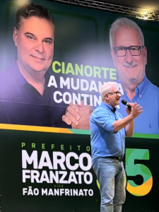 Marcão e Fão, Franzatro e Manfrinato são agora oficialmente os candidatos aprovados em convenção eleitoral a prefeito e vice-prefeito de Cianorte pelo PSD e MDB em um projeto de reeleição de Marco Franzato com o lema A Mudança Continua e a História da transformação tem nome e sobrenome Marco Franzato e Fão Manfrinato.