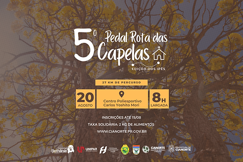 O 5ª Pedal Rota das Capelas de Cianorte – Edição dos Ipês está marcado para 20 de agosto e terá um plantio de mudas. Outra novidade é um café da manhã antecedendo a largada. As inscrições começam nesta quinta-feira (20), por formulário on-line https://forms.gle/UFyrFPmVMoa2SzA1A, e seguem até 15 de agosto.