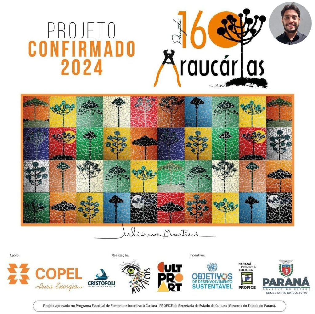 O projeto “160 araucárias” da artista plástica Juliana Martini, foi aprovado no PROFICE e tem o apoio da COPEL e Cristofoli. Público alvo: Maiores de 16 anos.