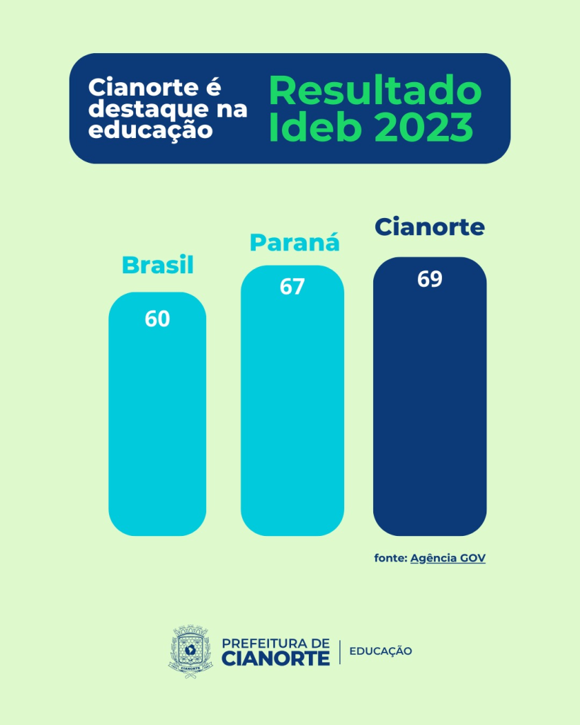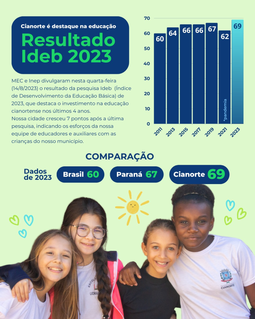 Após um ciclo de cinco avanços positivos interrompidos em 2021 pela pandemia de covid19, agora em 2023 a Educação Pública Municipal de Cianorte voltou a crescer e alcançou o maior valor da história: 69. A média Brasil foi 60, a média Paraná foi 67 e Cianorte 69. Se retirarmos a pandemia de covid19 que afetou todos os resultados em 2021, Cianorte tem resultados crescentes e positivos desde 2001.