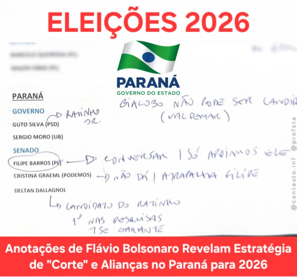 Novas revelações contidas nos manuscritos do senador Flávio Bolsonaro (PL-RJ), obtidos após uma reunião de cúpula do Partido Liberal e divulgadas pelo canal Metrópoles, trazem à tona o “mapa da mina” para as eleições de 2026 no Paraná. O documento detalha não apenas quem o clã Bolsonaro pretende apoiar, mas também quem está sendo “rifado” ou enfrentando forte resistência interna na construção do palanque presidencial de Flávio no estado.
