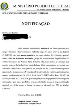 Então o Ministério Público Eleitoral da 88ª Zona Eleitoral (de Cianorte PR) se manifestou. Após identificação do contratante, SUGERIU que em 24 horas seja retirada a mensagem do outdoor sob pretexto de irregularidade com artigos 36 e 39 da Lei 9504/97 e Artigo 26 da Resolução do TSE 23610/2018 e alerta de possível incriminação por delito contra a honra em contexto eleitoral.