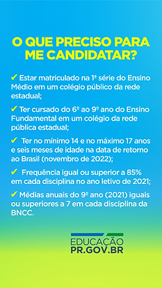 - Ter cursado do 6º ao 9º ano do Ensino Fundamental em instituição de ensino da Rede Pública do Estado do Paraná;