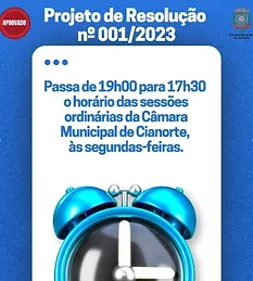 23 de fev. de 2023 – As sessões da Câmara de Vereadores de Cianorte agora tem novo horário de início, não mais às 19h e sim às 17h30.
